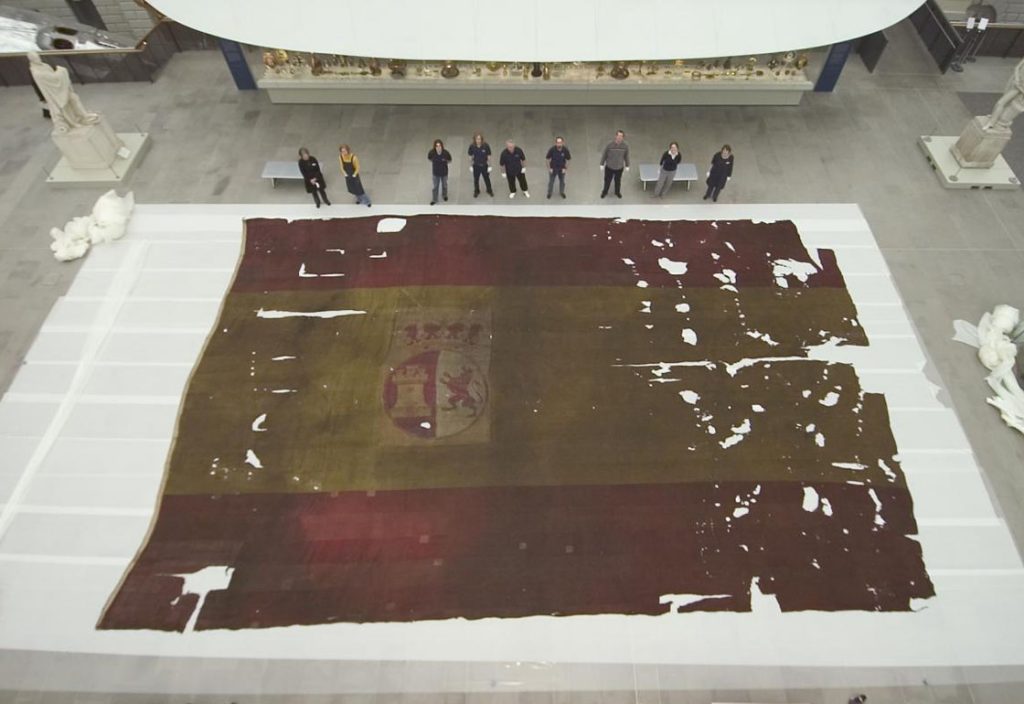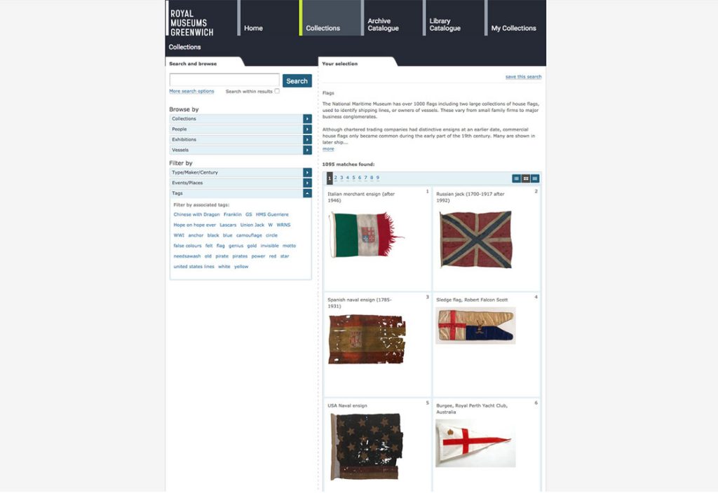 An example of this problem of object decontextualisation can be seen in the wild on the National Maritime Museum website. Their flag collection is excellent, but you can’t tell that one of these flags is larger than the others. Much larger. Really massive. So much bigger that it should be made clear when it sits next to the others in the archive: it’s extraordinary. It was captured from a Spanish warship (San Ildefonso) during the Battle of Trafalgar and it’s very difficult to imagine the size of boat this must have flown from.