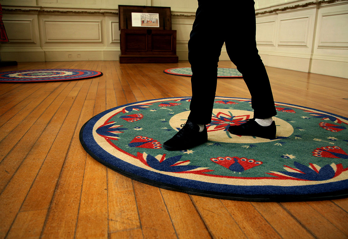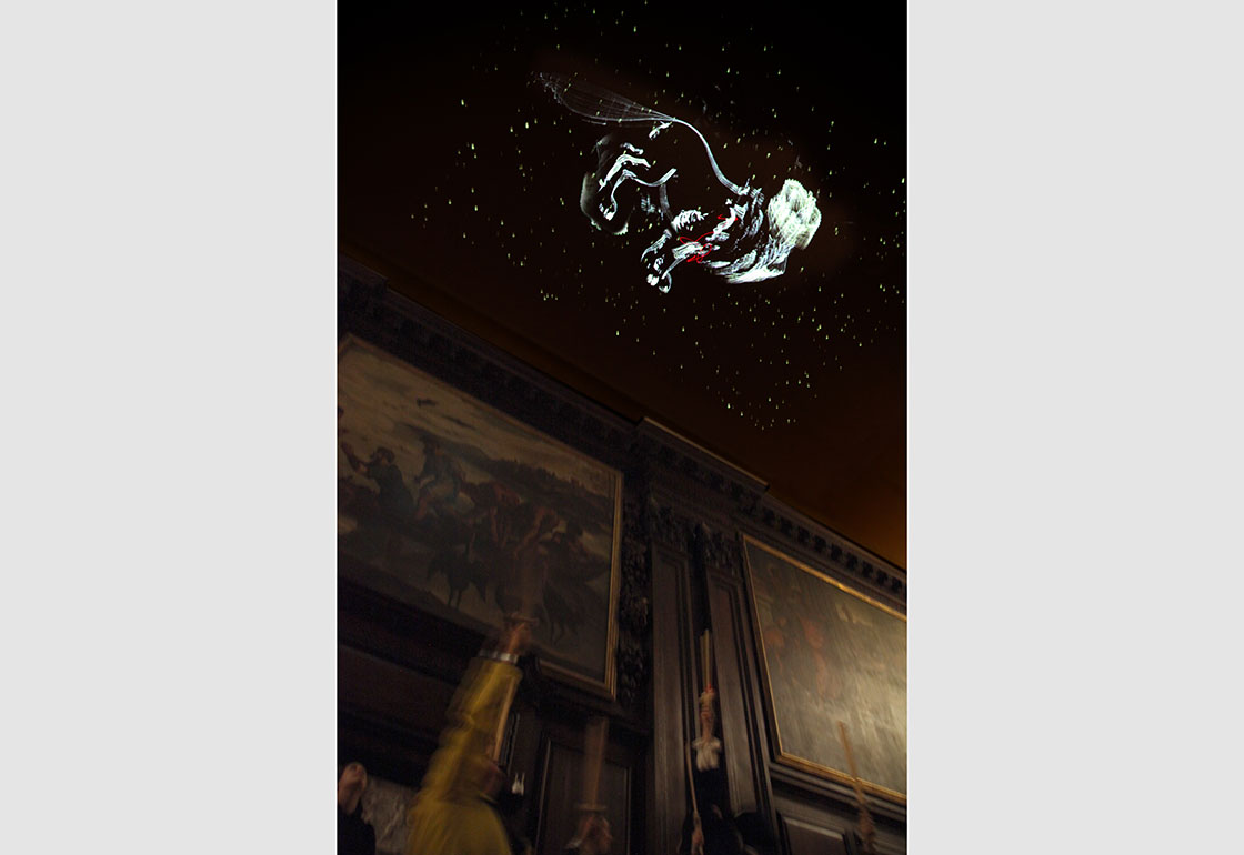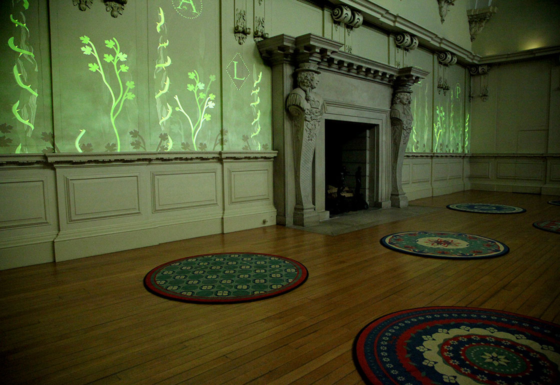 The Green Man took over the Queen’s Guard Chamber. Gnarly vines and growing stalks were projected on the walls. In order to reveal the hidden letters and reclaim the room, visitors had to step on keys that were hidden in the patterns of specially designed rugs.