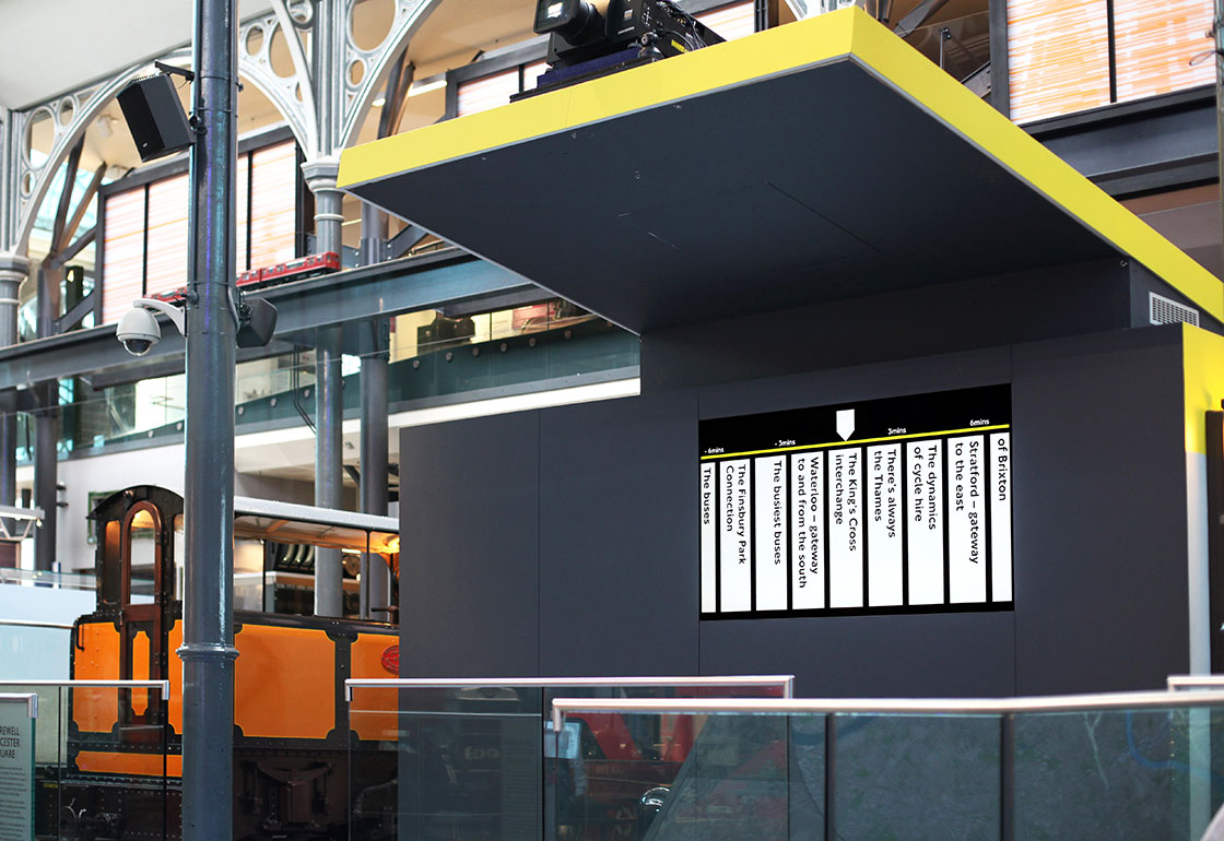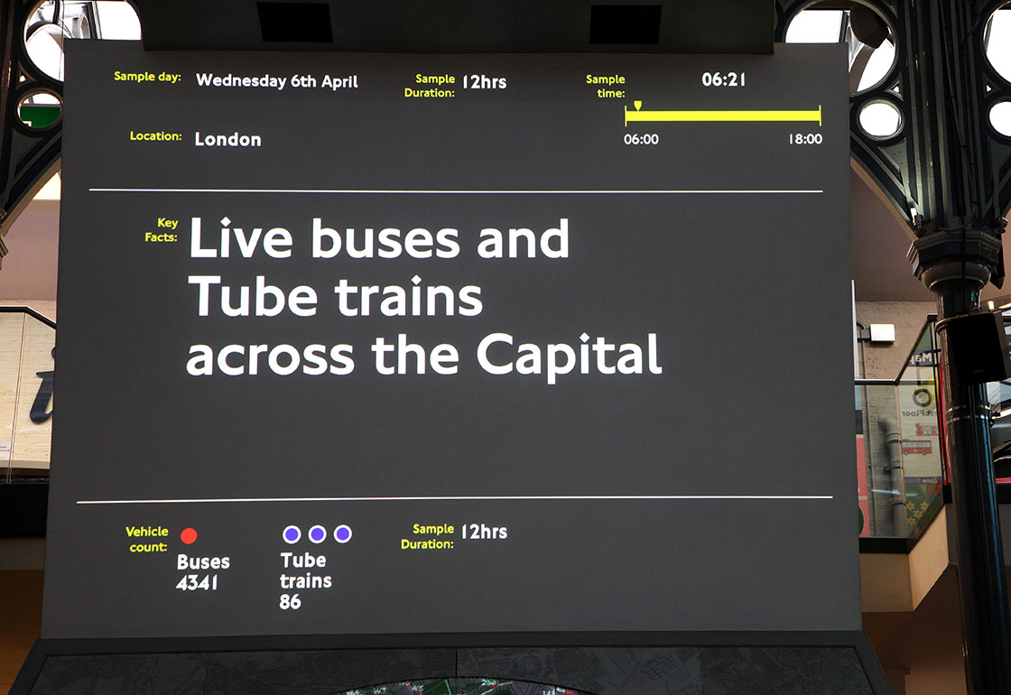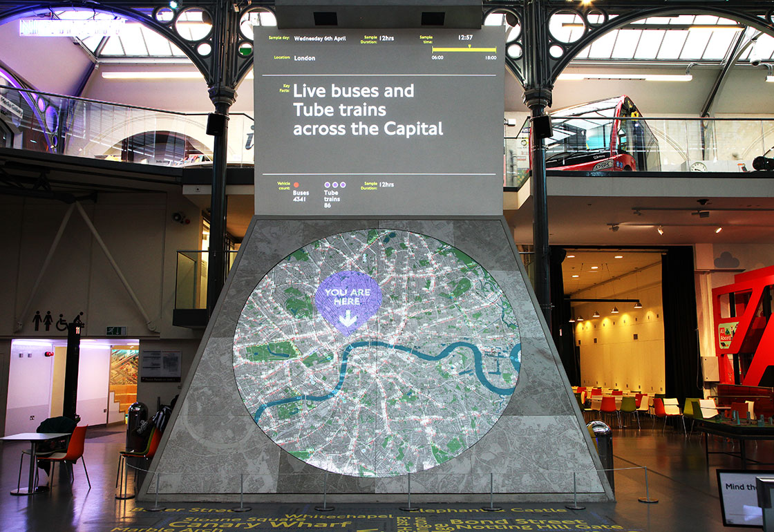 Working with CASA’s data feed we created a piece of software that can track and display London’s extensive transport network in real time. We developed visuals to tell the twelve stories of how the network connects. These are projected onto the large scale map in the central atrium of the transport museum.