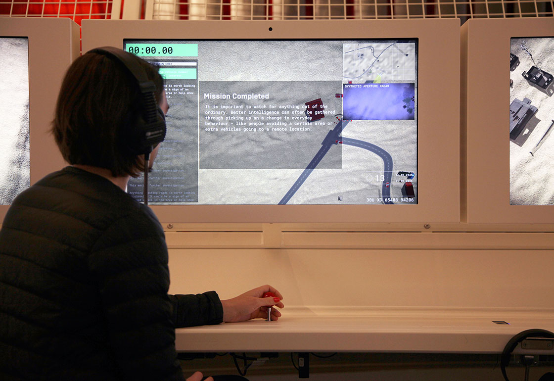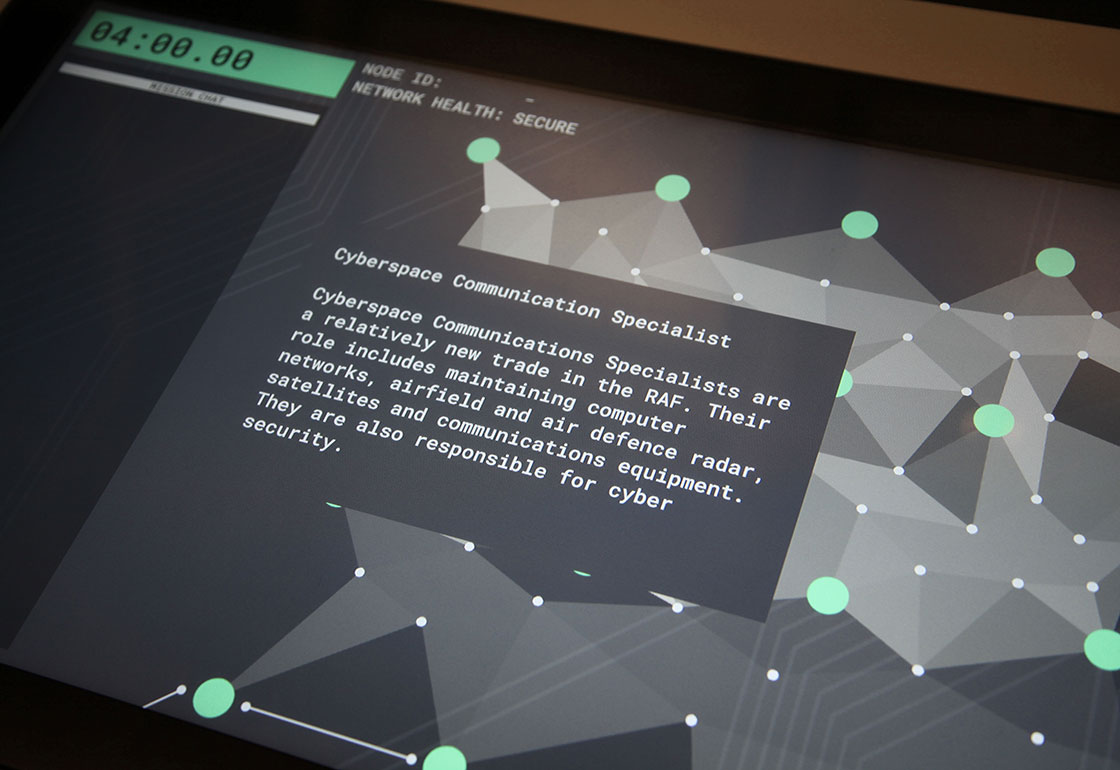 Communications Mission uses twelve screens and a range of physical interaction methods to help communicate the variety of roles the RAF undertakes. From surveillance and intelligence gathering to cyber communications. This range of fast paced games and challenges was developed in consultation with the ISR (Intelligence, Surveillance, and Reconnaissance) Unit to ensure that where possible the interactives are as accurate as possible.