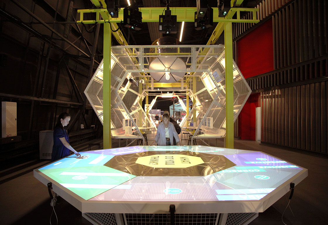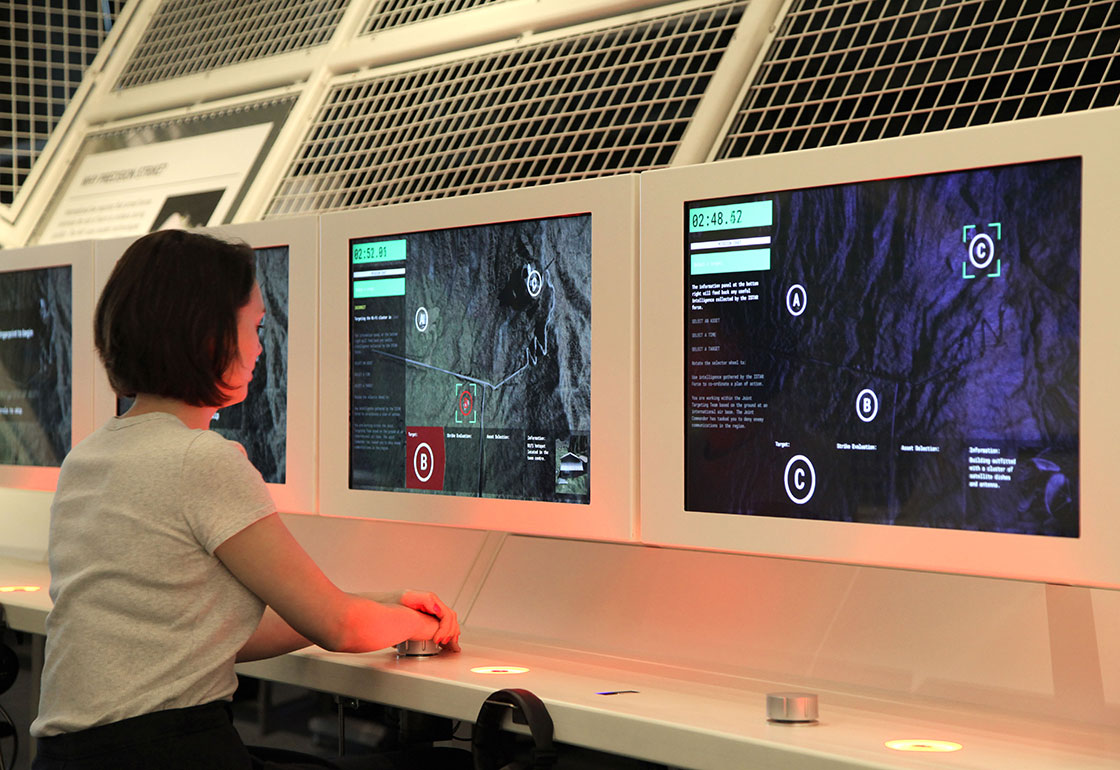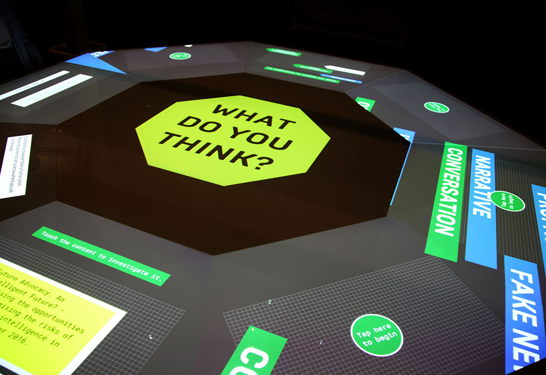The Debate Space is a four meter wide touch sensitive table. Nine overhead projectors show content on the table and work together to create a giant interactive surface that acts as a forum for evidence gathering, conversation, and debate. Launching with the topics of drone warfare and the use of artificial intelligence, the table helps groups of students, cadets and visitors learn about the format and function of debate as well as investigate the two sides of these controversial subjects.