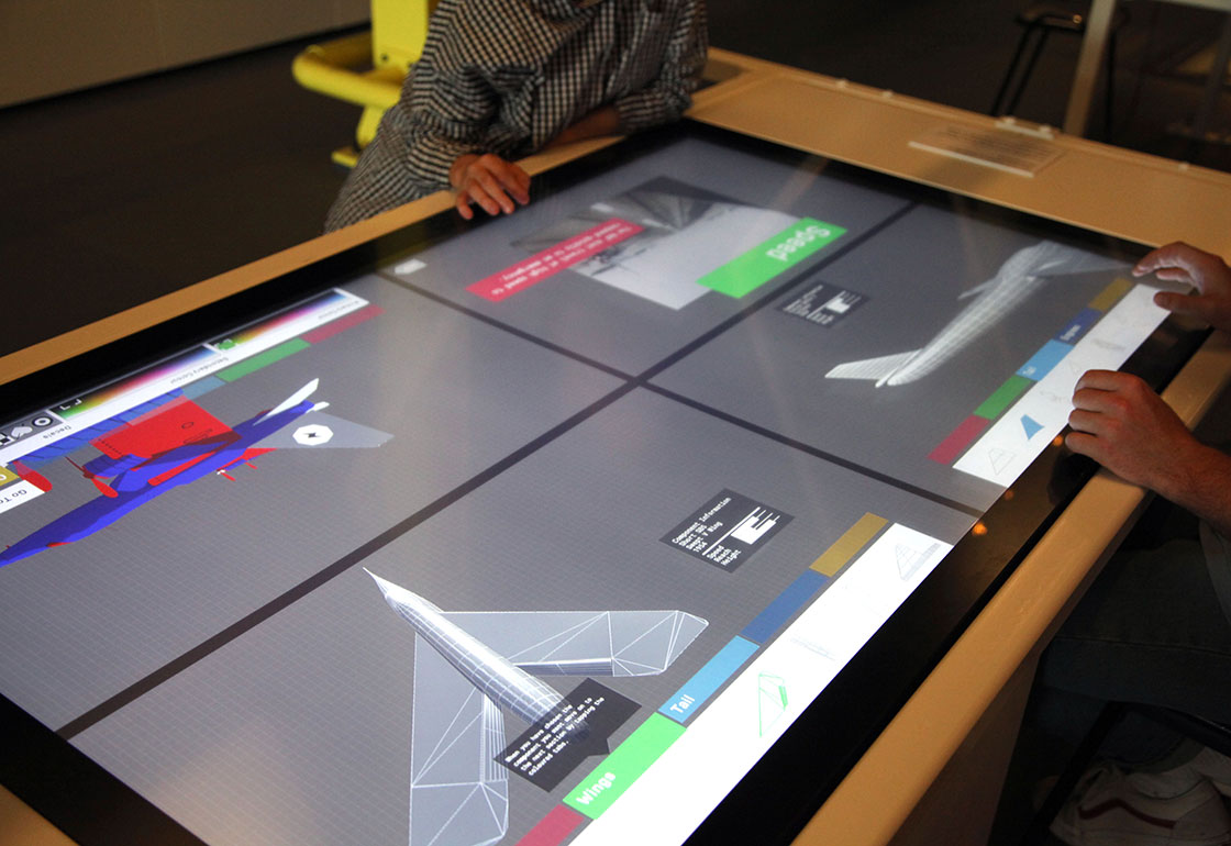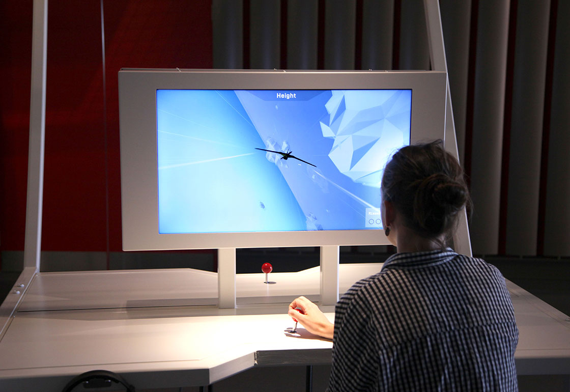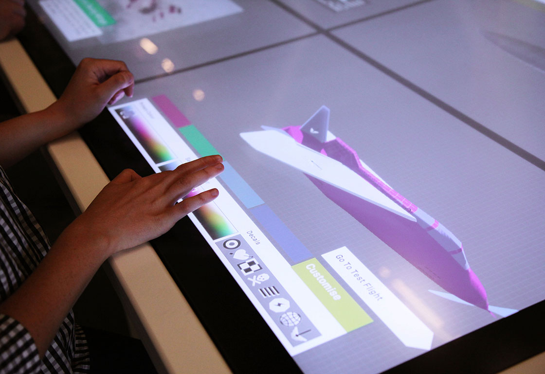 Design in Action allows visitors to concoct their own aircraft using parts of iconic RAF planes from throughout the ages. Visitors do this on a large digital drafting table, dragging and dropping various wings and engines etc., to design their own custom creation. They can then fly their plane and test it against one of three missions in the neighbouring pilot pods.