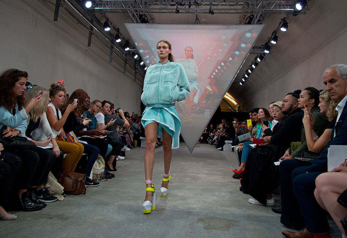 Collaborating closely with Fyodor Golan we created a large pyramid that floated just above the catwalk.Four audience members filmed the show on mobile devices running a custom app we developed. This footage went through a render process that applied distortion and warping effects to the live feed, before being projected in real time, inside the pyramid.
