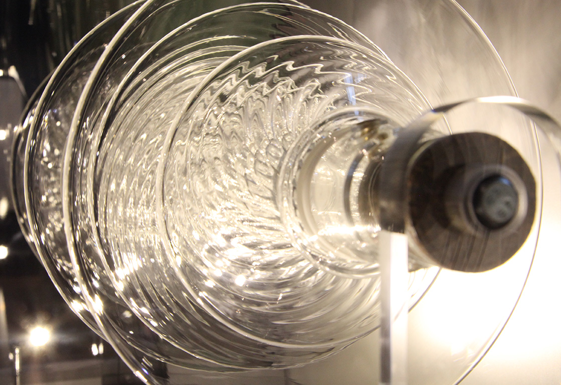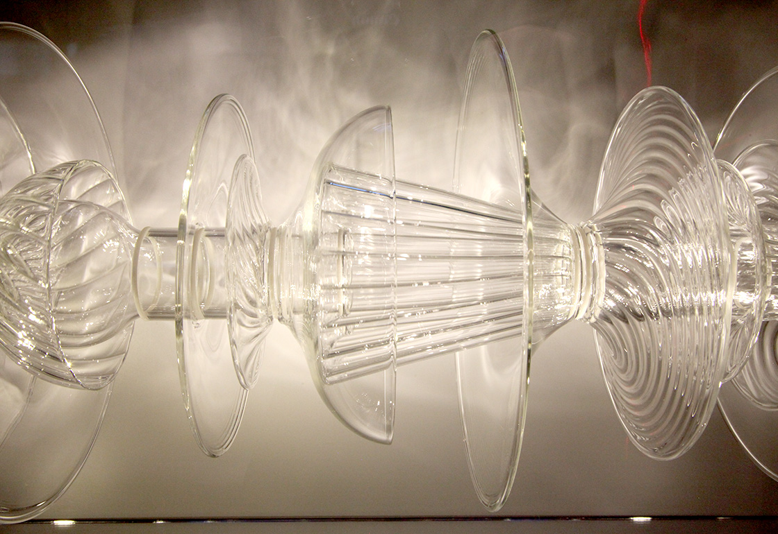 We wanted the installation’s form to hark back to that of a classic jukebox, with its curved glass top and panel display of song titles, but also for it to compliment Bethan’s glass artwork housed inside. The artwork itself slowly rotates, with its many layered discs mimicking that of a stack of vinyl records. The visitor slides a controller to move through the tracks, which cross-face into each other, illuminating their name and song title as they are selected. A laser line moves across the glass artwork, refracting as it follows the contours of its form. Lights inside the unit reflect across the piece, casting moving reflections and shadows across the walls. The music is played through localised pod speakers above the installation, creating an immersive audio experience.