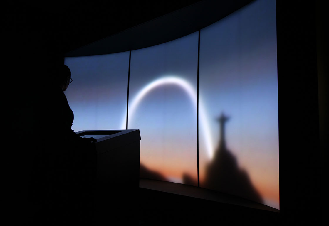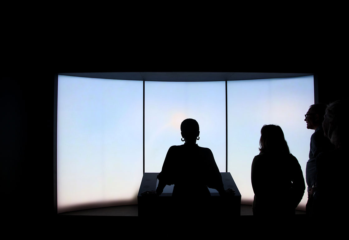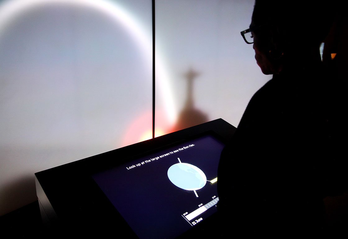 We wanted to simulate the drama and beauty of sunrises and sunsets inside the gallery. We created an atmospheric low resolution LED video wall placed behind frosted acrylic panels, that immersed the visitor and bathed them with a soft, rich light. Different locations and seasons could be selected on the accompanying touchscreen to show the variation in the Sun’s path. The interactive then showed the visitor, through beautiful colour gradients, the Sun’s arc throughout the day. The different locations had iconic silhouette landscapes to help locate the visitor.