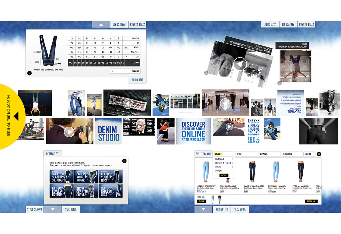 The Selfridges Denim Studio is the world’s largest denim retail destination, stocking over 400 different lines. With so many styles to choose from, how can the customer decide and discover the stories around the jeans: the brands, manufacturers, histories, and the range of denim on offer? Selfridges wanted an interactive solution that could facilitate conversations between customers and the Selfridges Denim experts.