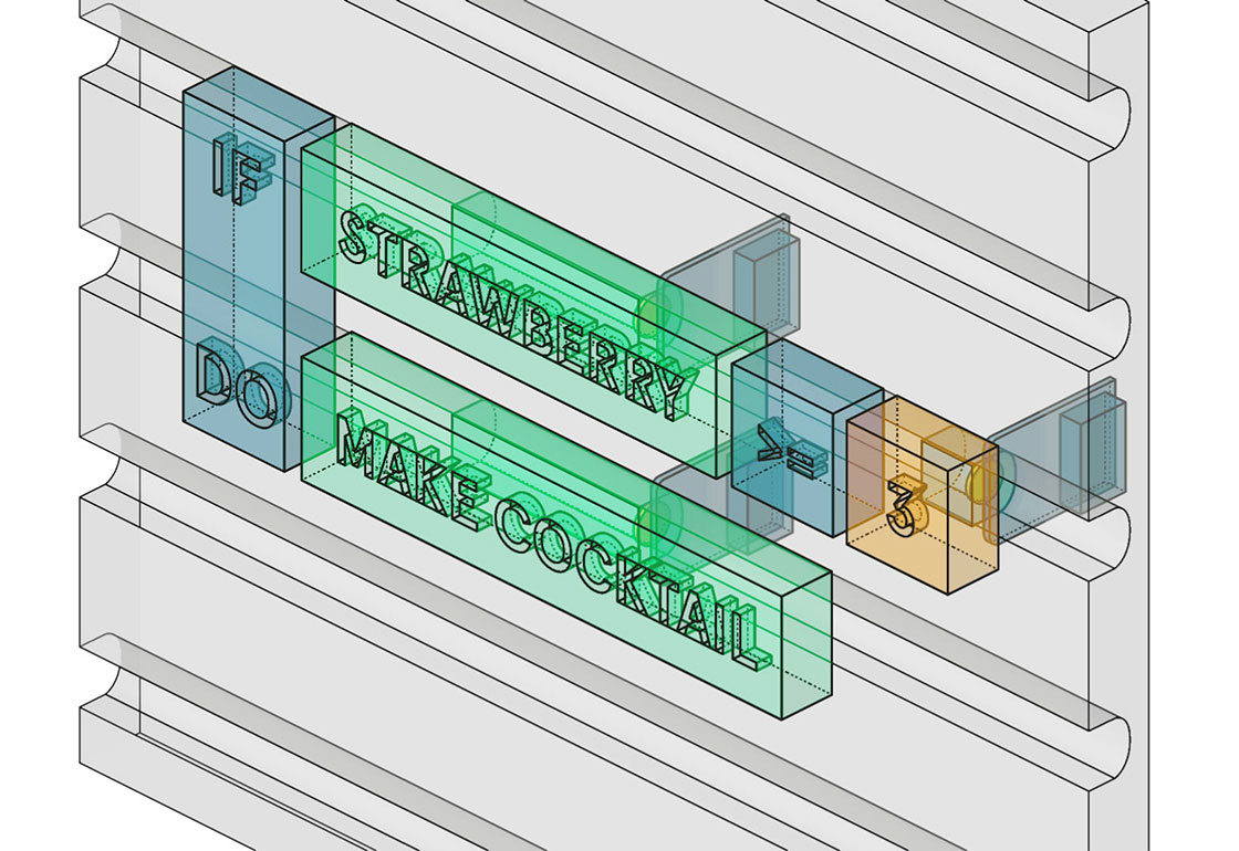 We were interested in creating a playful system that encouraged visitors to the beach to interact with coding environments. Using brightly painted wood blocks we played on the simplicity of children’s toys as a physical language to introduce technical concepts. By arranging the wooden blocks into different configurations the participants could build an algorithm – with each correct configuration resulting in a free juice.